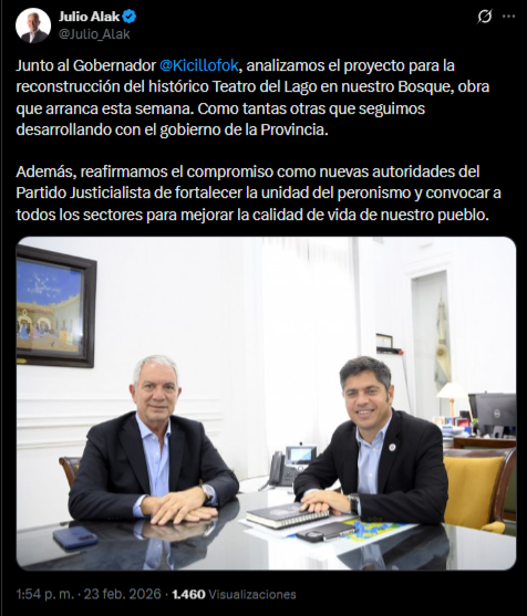 En su cuenta oficial de X, el intendente Alak compartió una foto junto con el gobernador Kicillof. “Junto al Gobernador, analizamos el proyecto para la reconstrucción del histórico Teatro del Lago en nuestro Bosque, obra que arranca esta semana. Como tantas otras que seguimos desarrollando con el gobierno de la Provincia.”, afirmó.