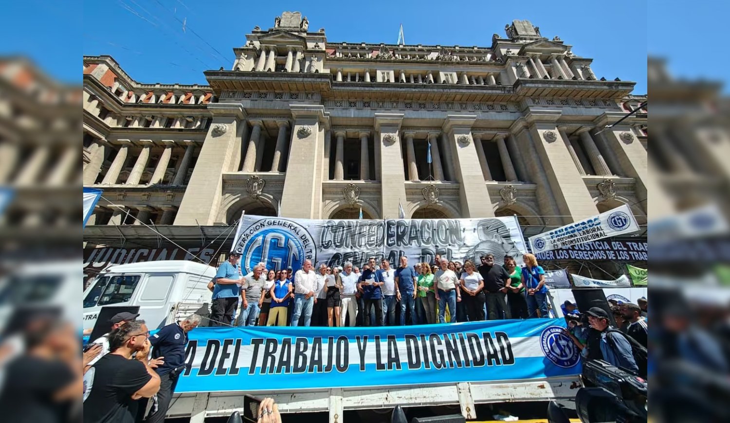 En la puerta de los tribunales, donde la central obrera convocó a una manifestación para respaldar la presentación, uno de sus cosecretarios generales, Jorge Sola, afirmó que la organización acudió a la Justicia en ejercicio de su derecho a peticionar y expresó su confianza en que el Poder Judicial “va a cuidar el cumplimiento de la Constitución Nacional”.