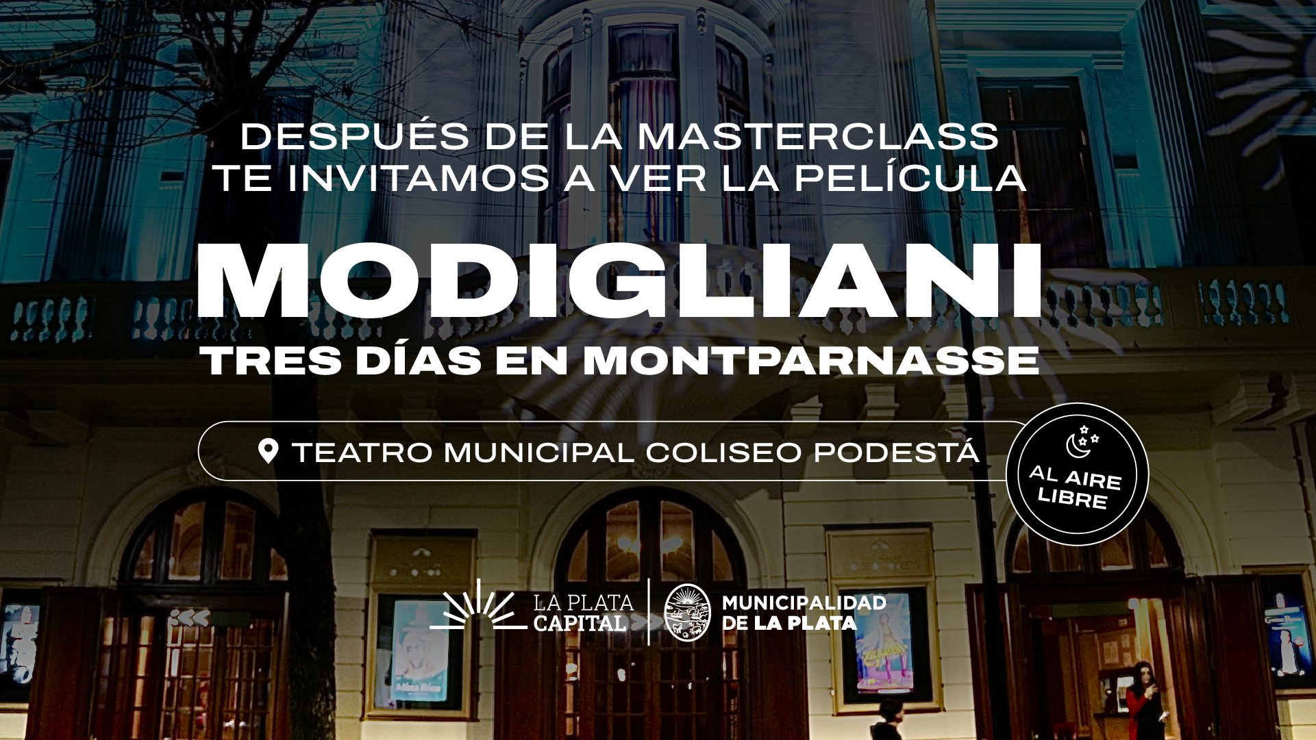 La Municipalidad de La Plata anunció que, una vez finalizada la masterclass que el reconocido artista Johnny Depp ofrecerá esta tarde en el Teatro Municipal Coliseo Podestá, se transmitirá en vivo la película Modigliani, tres días en Montparnasse en las pantallas dispuestas fuera del establecimiento para que el público pueda disfrutarla al aire libre.