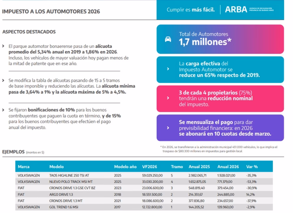 Desde este mes comenzará a regir en la provincia de Buenos Aires el nuevo esquema del Impuesto a los Automotores 2026, que combina una reducción nominal de la patente para el 75% de los vehículos con la posibilidad de pagarla en hasta 10 cuotas mensuales.